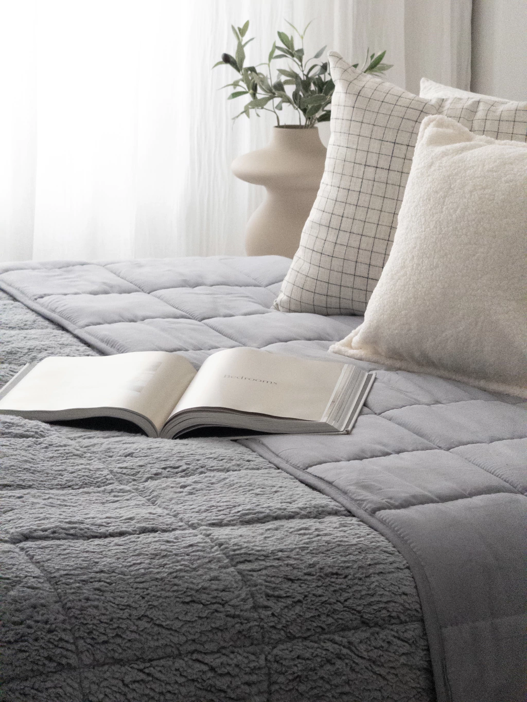 Acolchado bitono teddy gris twin, de microfibra con reverso de corderito. Ideal para cualquier estación, este acolchado combina estilo y confort.