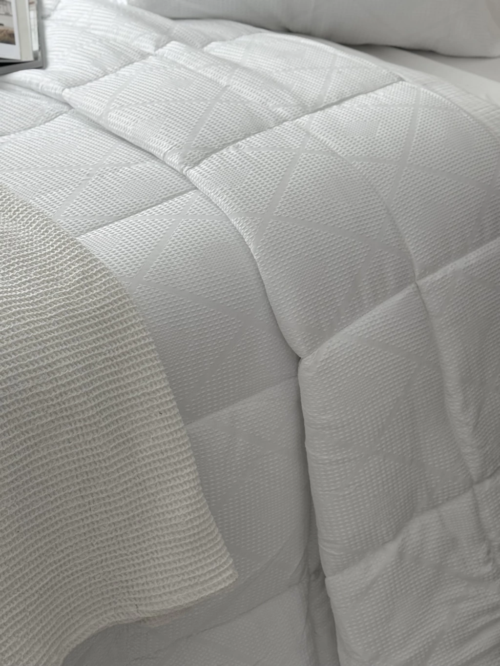 Disfrutá de la suavidad de este acolchado color blanco, con relleno 100% poliéster. Ideal para camas king, brinda abrigo, confort y un toque elegante a tu dormitorio.