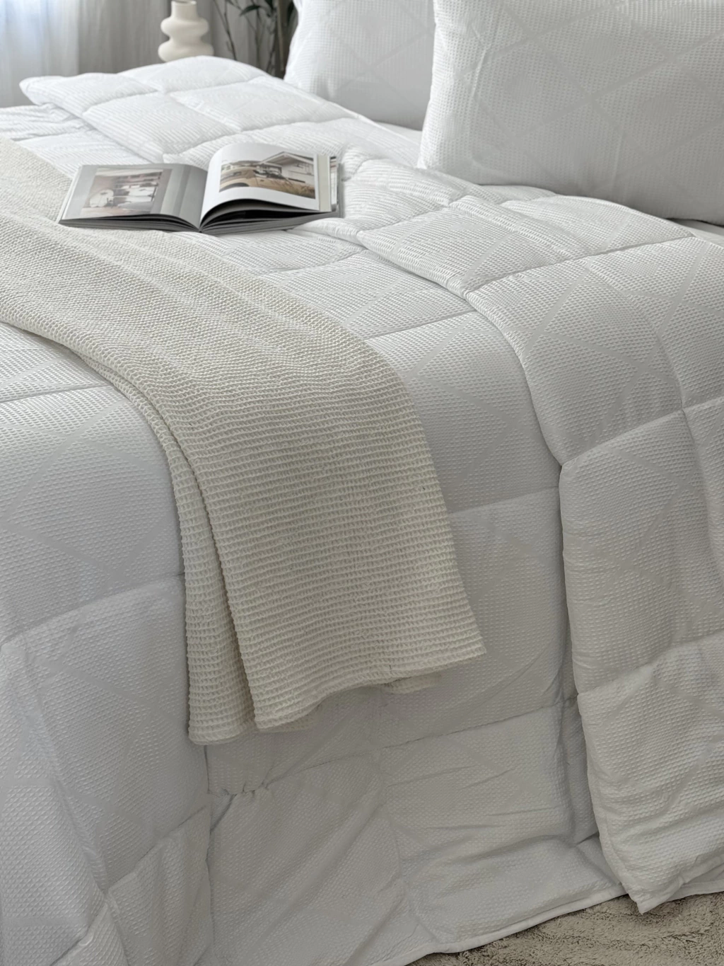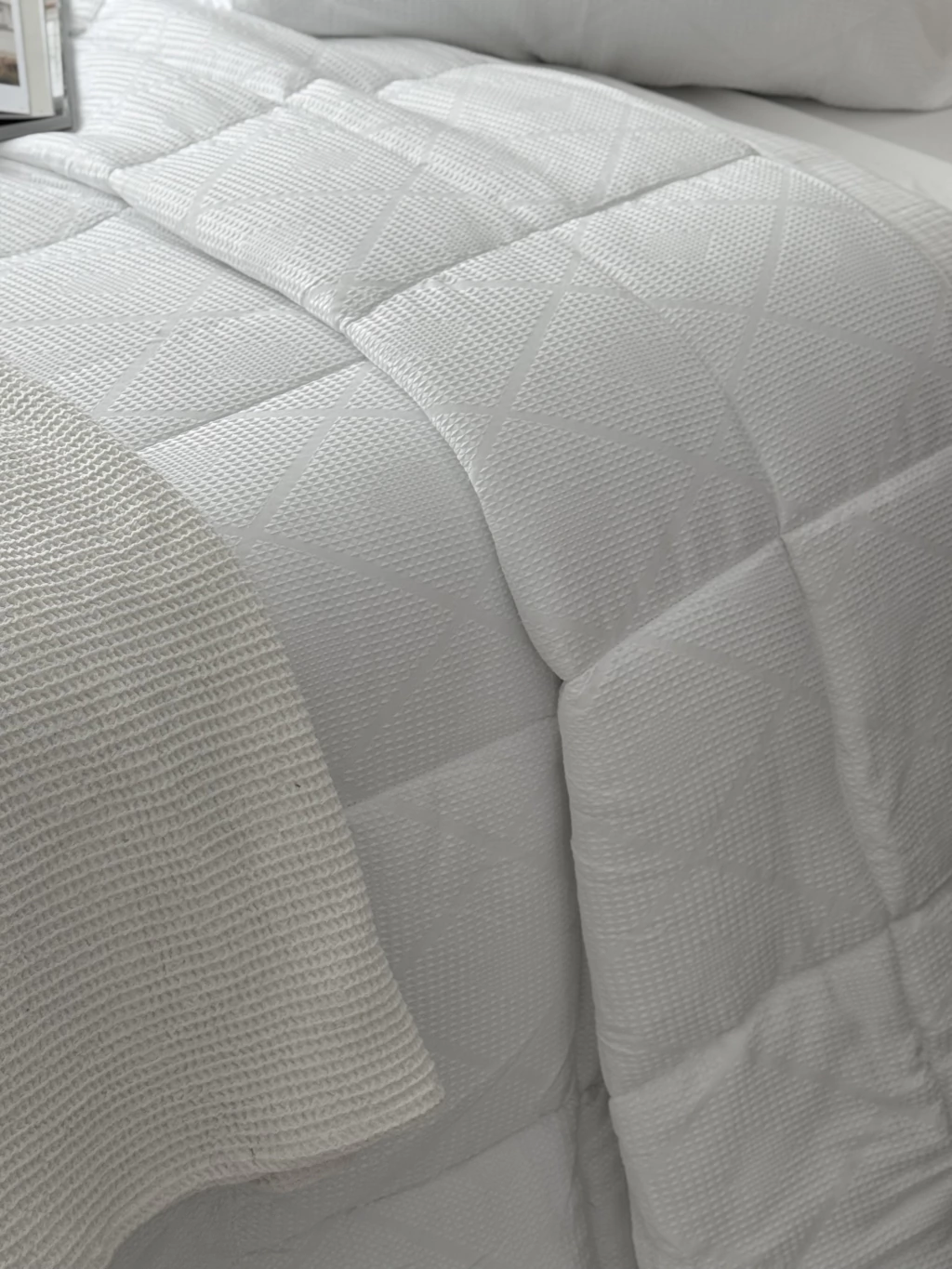 Disfruta de la calidez y suavidad de este acolchado color blanco, con relleno 100% poliéster. Ideal para camas twin, brinda abrigo, confort y un toque elegante a tu dormitorio.