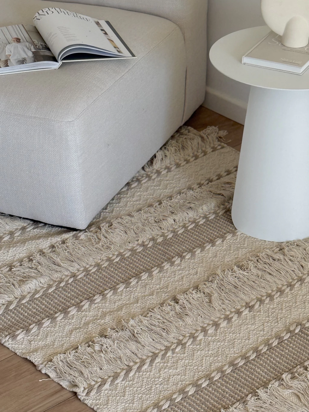 Alfombra con flecos, perfecta para tu dormitorio o living. Artesanal, importada de India. Medidas aproximadas: 120x170 cm Cuidados: Lavado a temperatura fría, no blanquear con cloro, planchado a temperatura tibia, secado a máquina baja temperatura, no en caliente. Las imágenes son a modo de ilustración