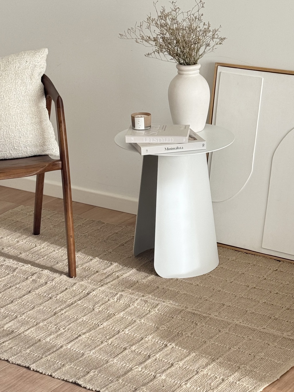 Alfombra Tejida Beige. Ideal para espacios medianos como dormitorios o salas de estar. Su tamaño permite colocarla parcialmente debajo de una cama o frente a un sofá, aportando calidez y confort.