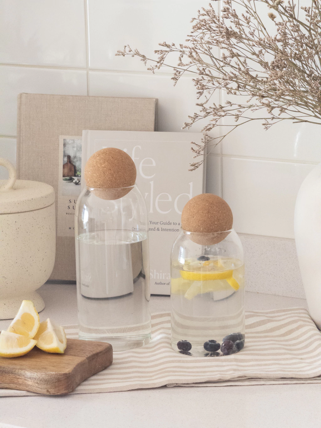 Botella de vidrio transparente con tapa esfera de madera, Excelente accesorio para tu día a día. Apto para temperaturas frías.