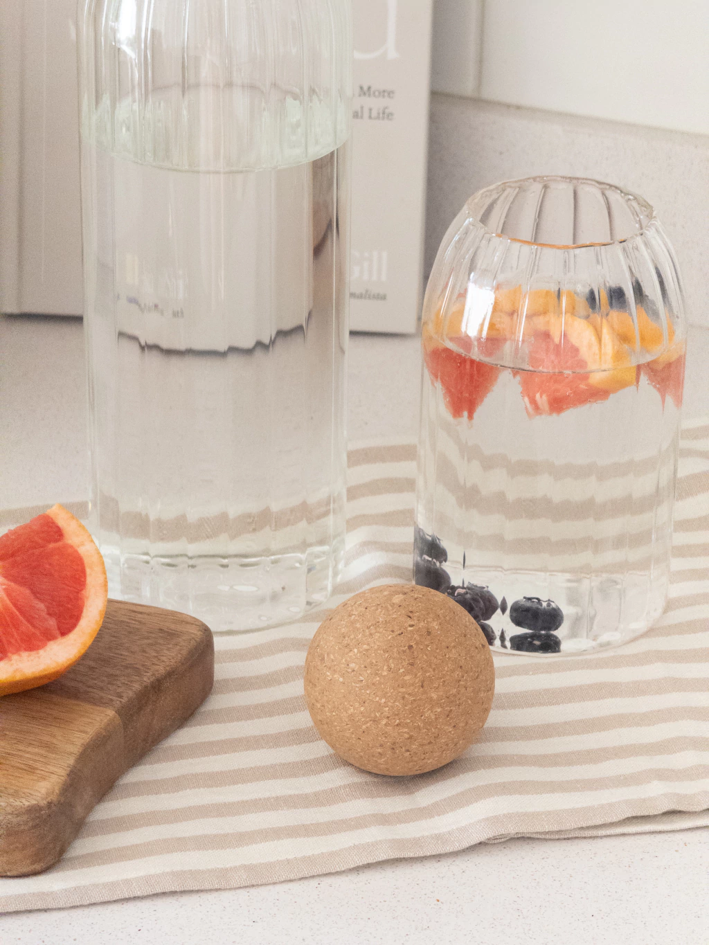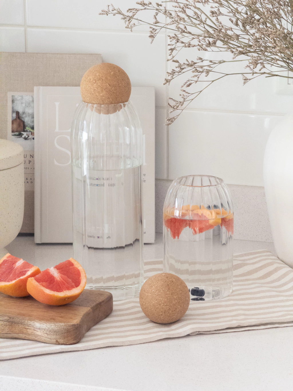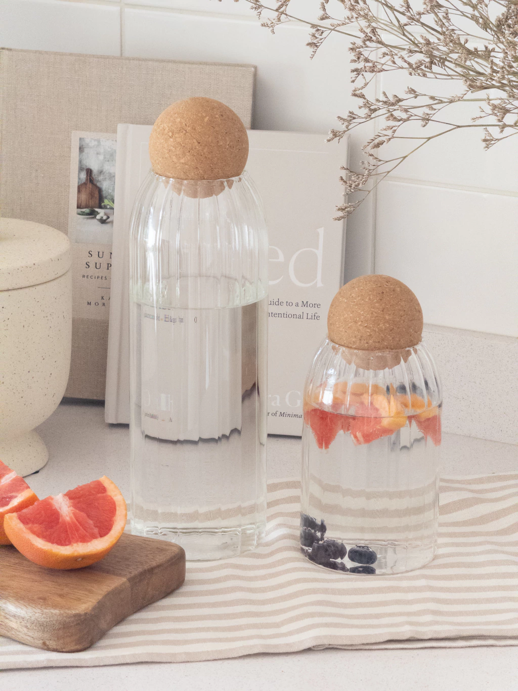 Botella de vidrio con rayas transparente con tapa esfera de madera, Excelente accesorio para tu día a día. Apto para temperaturas frías.