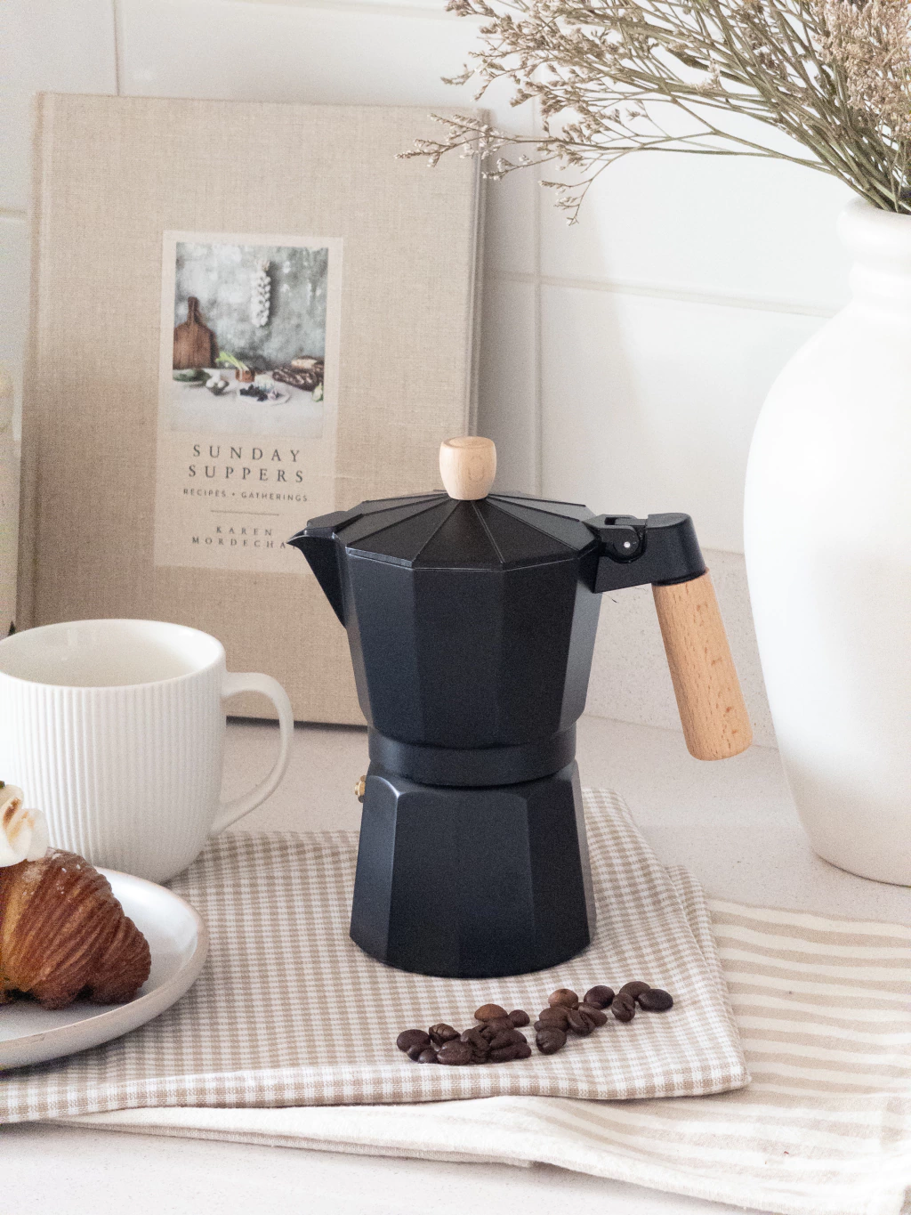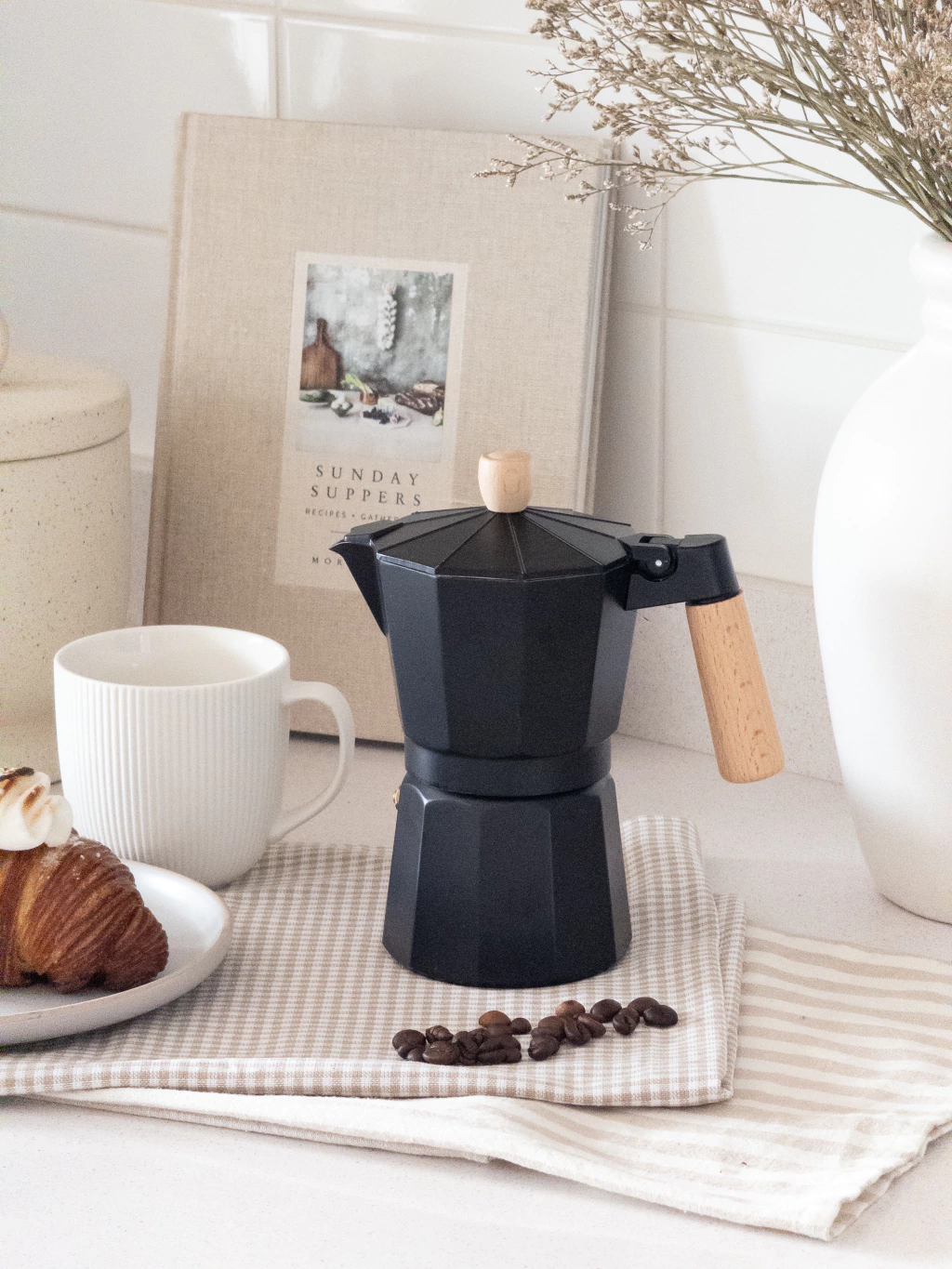 Cafetera con mango de madera, de color negro. Excelente para empezar las mañanas con un rico café.