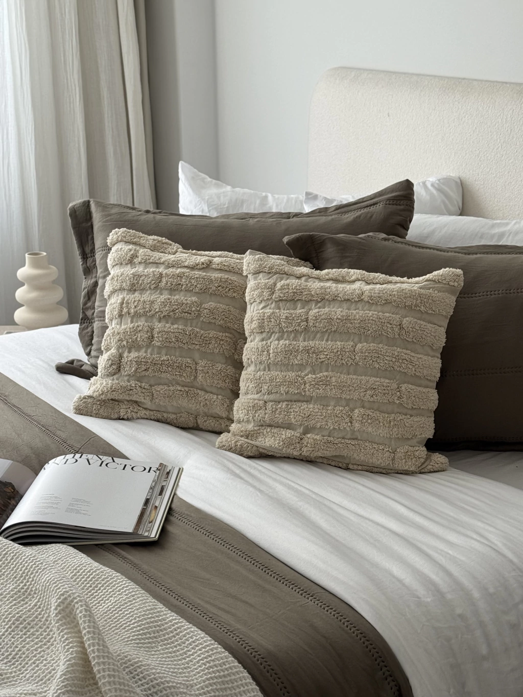 Funda con relieve beige. Ideal para dormitorios y livings, aporta elegancia y confort. Importada de India.
