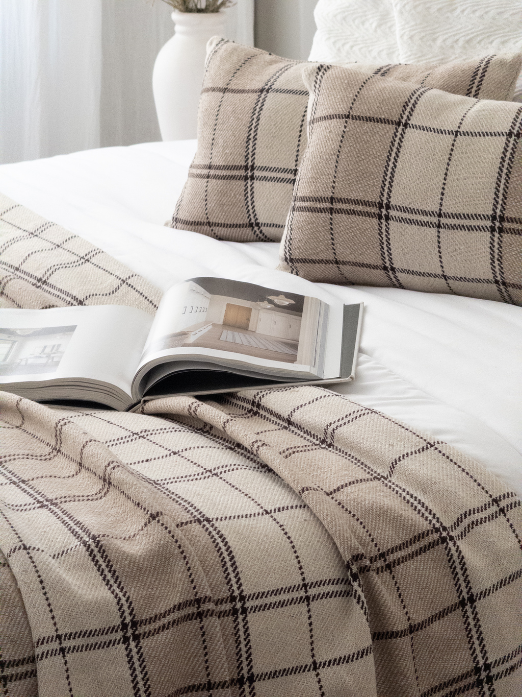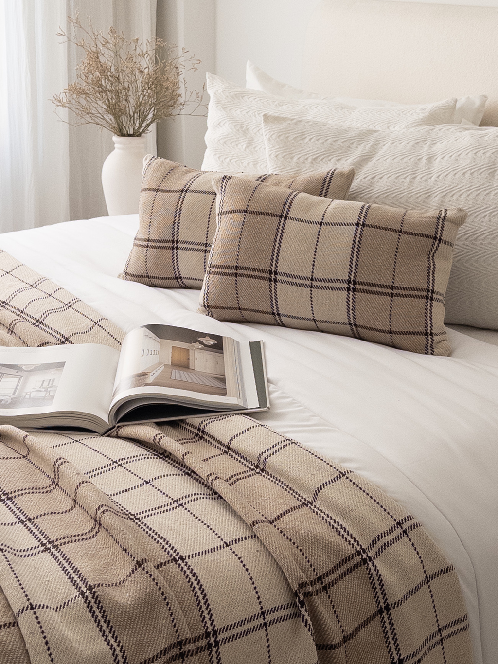 Funda cuadrillé natural, apertura mediante cierre en la parte superior. Ideal para dormitorios y livings, aporta elegancia y confort.