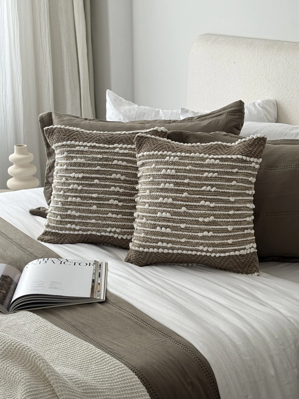 Funda tejida color marrón full líneas y pompones. Ideal para dormitorios y livings, aporta elegancia y confort. Importada de India.