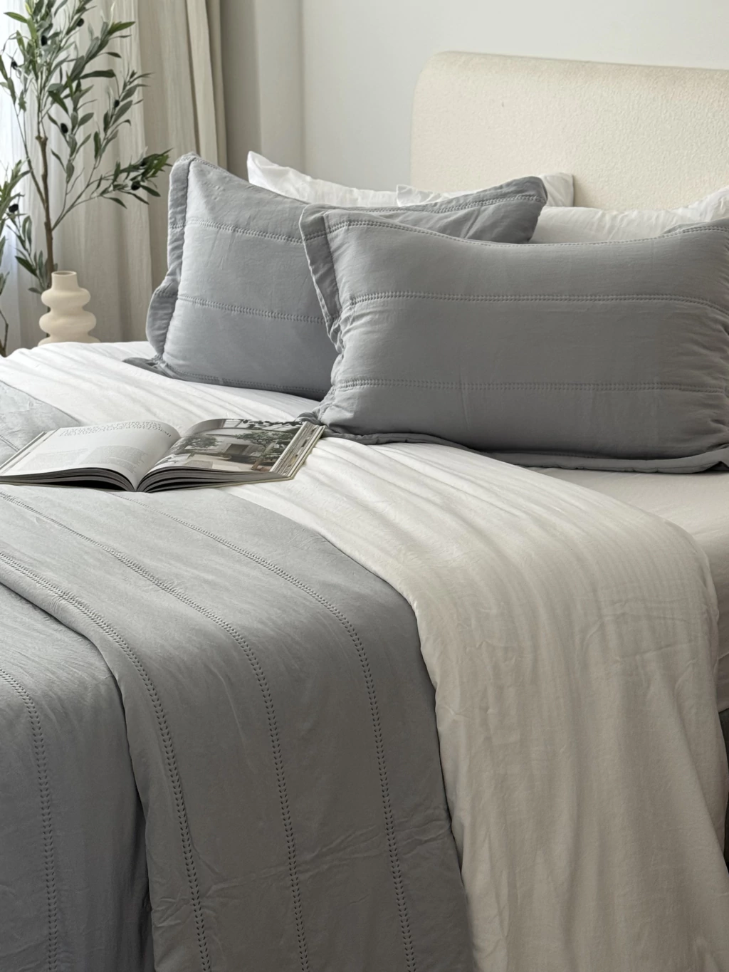 Kit Sonic color gris. Este set incluye un cobertor de 160x240 cm + 1 funda 50x70 cm + 1 juego de sabanas completo color blanco, ideales para camas de 100x200 cm. Calidad, suavidad y elegancia para renovar tu dormitorio