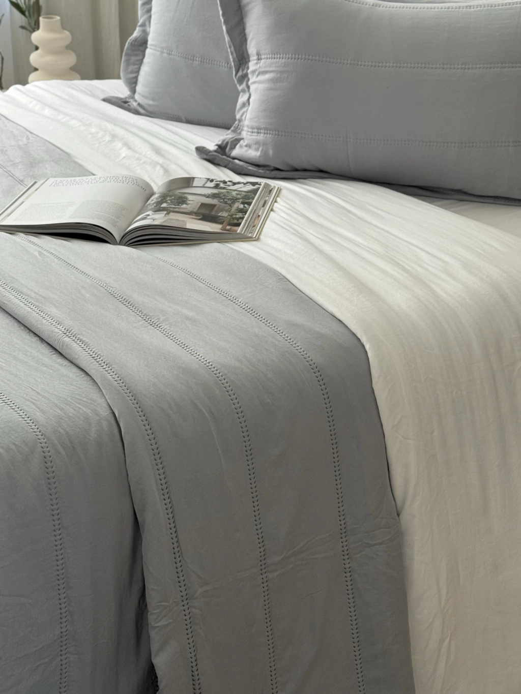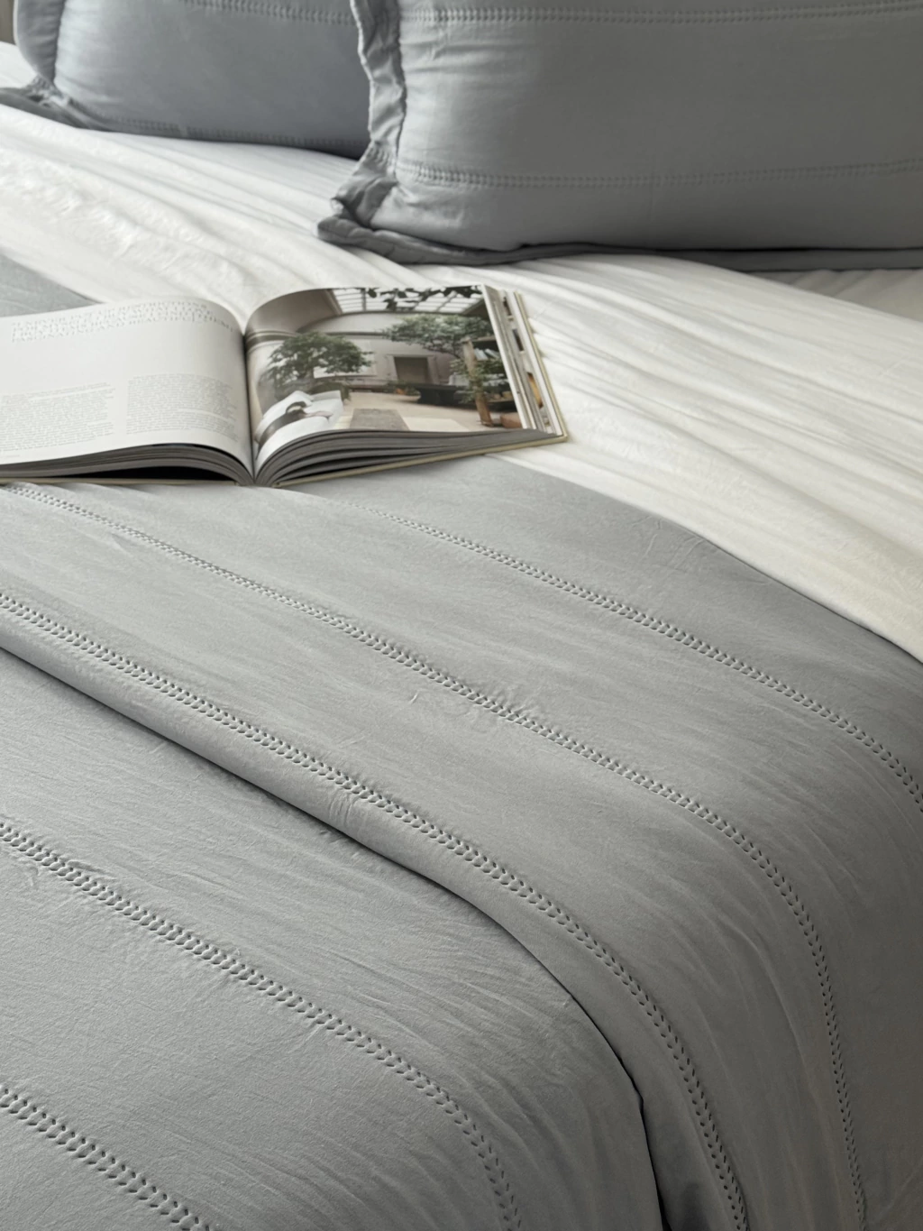 Kit Sonic color gris. Este set incluye un cobertor de 250x280 cm + 2 fundas 50x90 cm + 1 juego de sabanas completo color blanco, ideales para camas de 200x200 cm. Calidad, suavidad y elegancia para renovar tu dormitorio