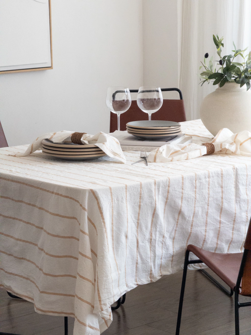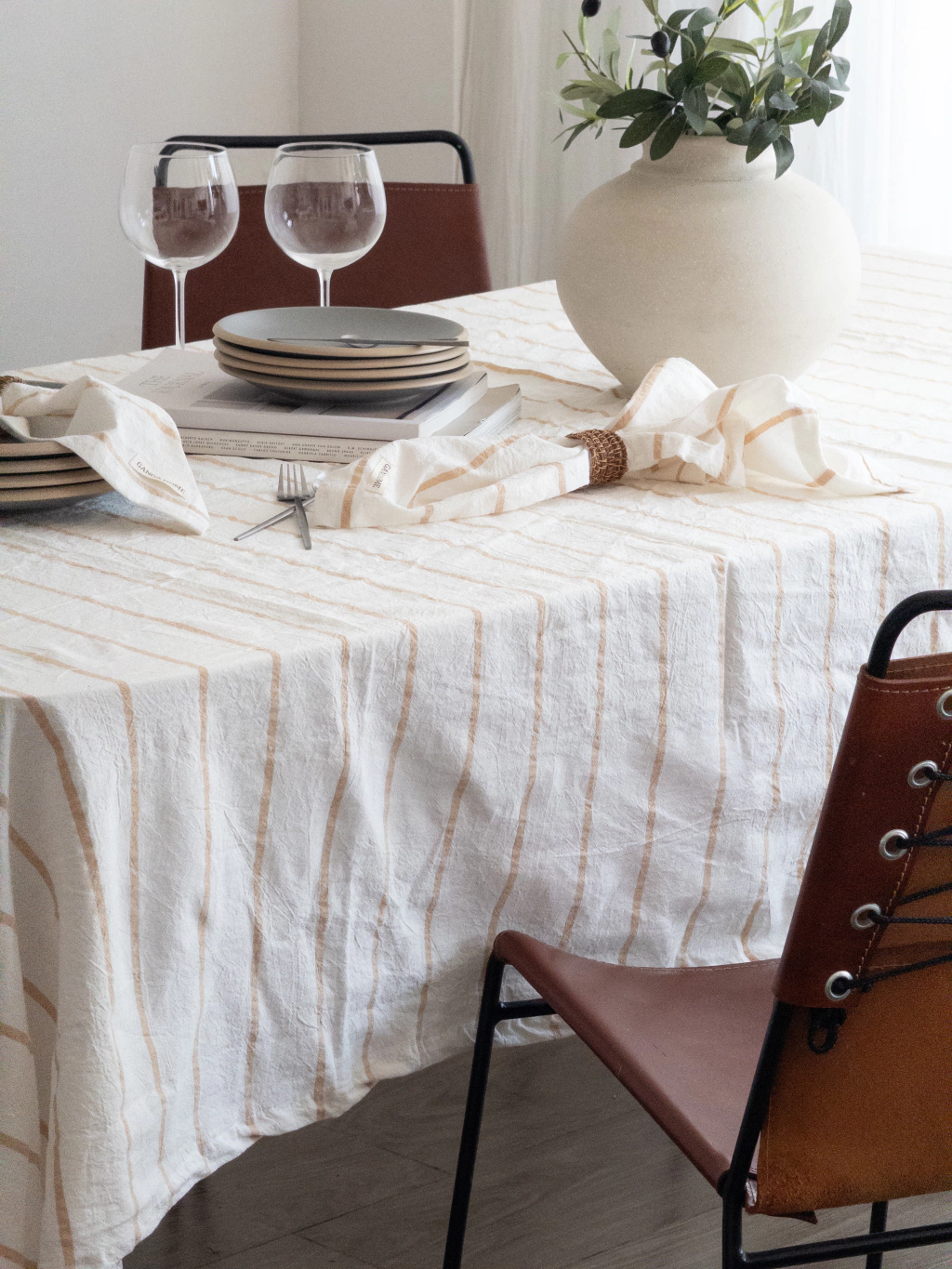 Fabricado en Tusor rayado 100% algodón. Convierte cualquier ocasión en un momento especial con este set esencial para tu hogar.