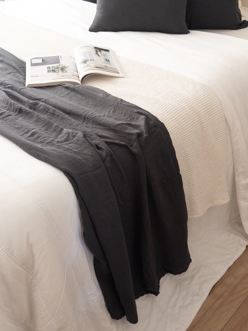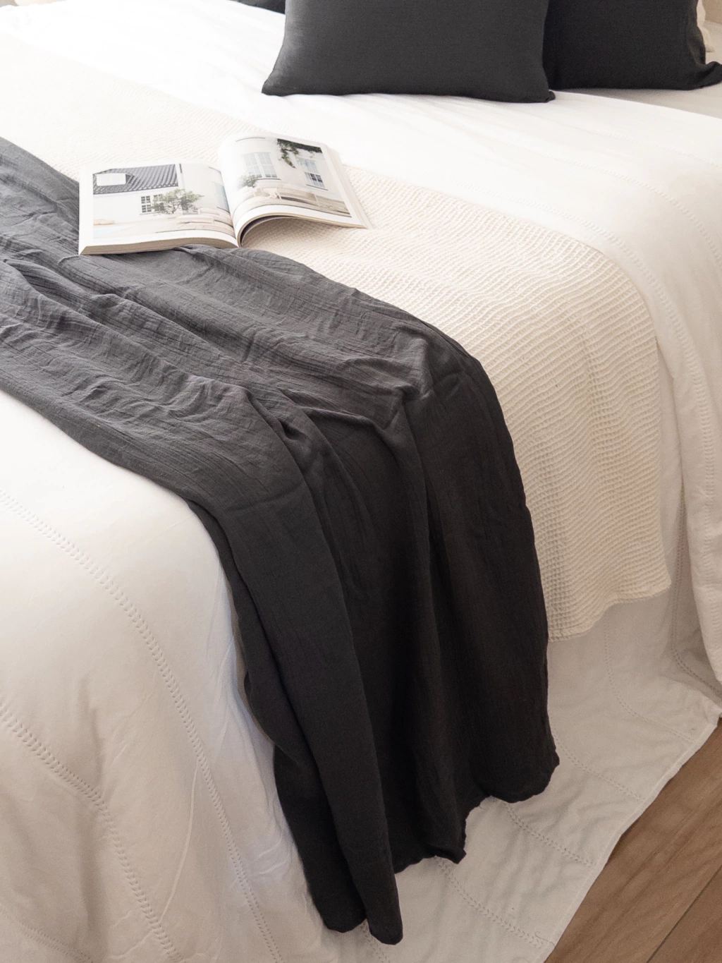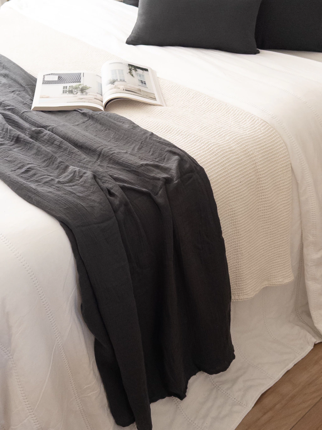 Piel de cama color gris grafito su tamaño amplio lo hace ideal para camas grandes, es perfecto para sumar color a tu habitación. Puede ser combinado con el set x3 fundas Filipa Gris Grafito.