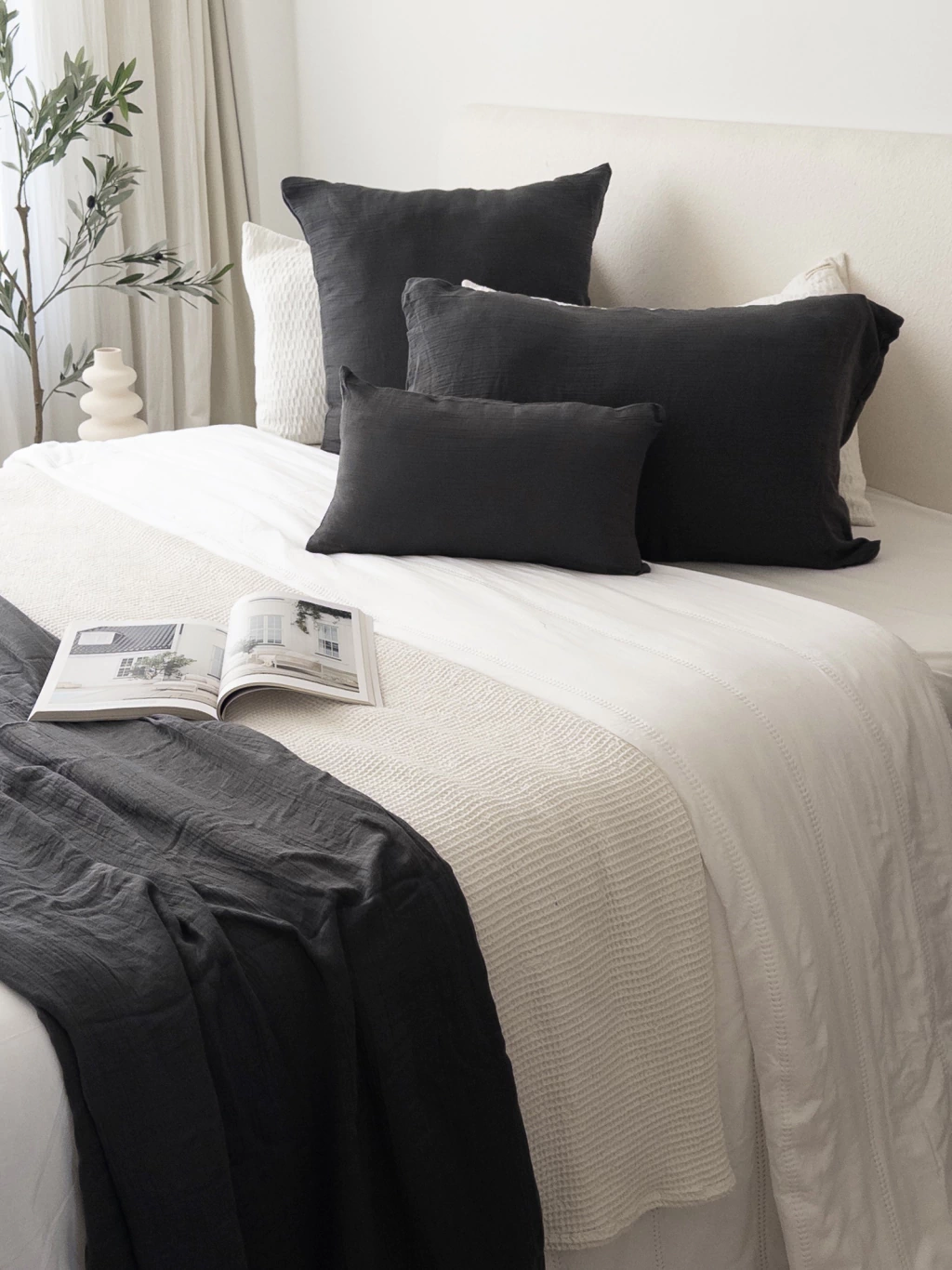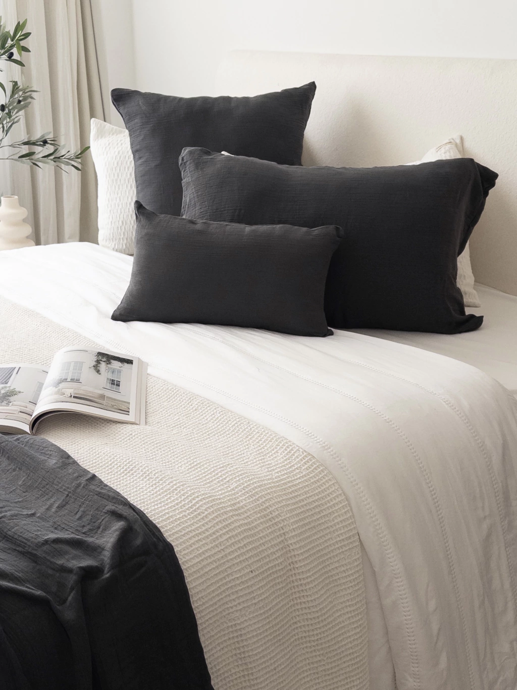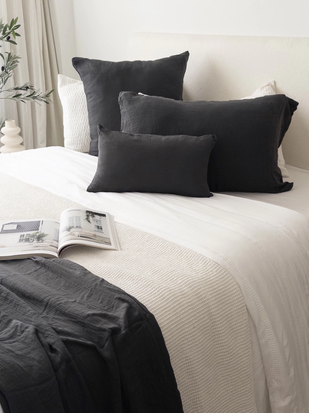 Piel de cama color gris grafito su tamaño amplio lo hace ideal para camas grandes, es perfecto para sumar color a tu habitación. Puede ser combinado con el set x3 fundas Filipa Gris Grafito.