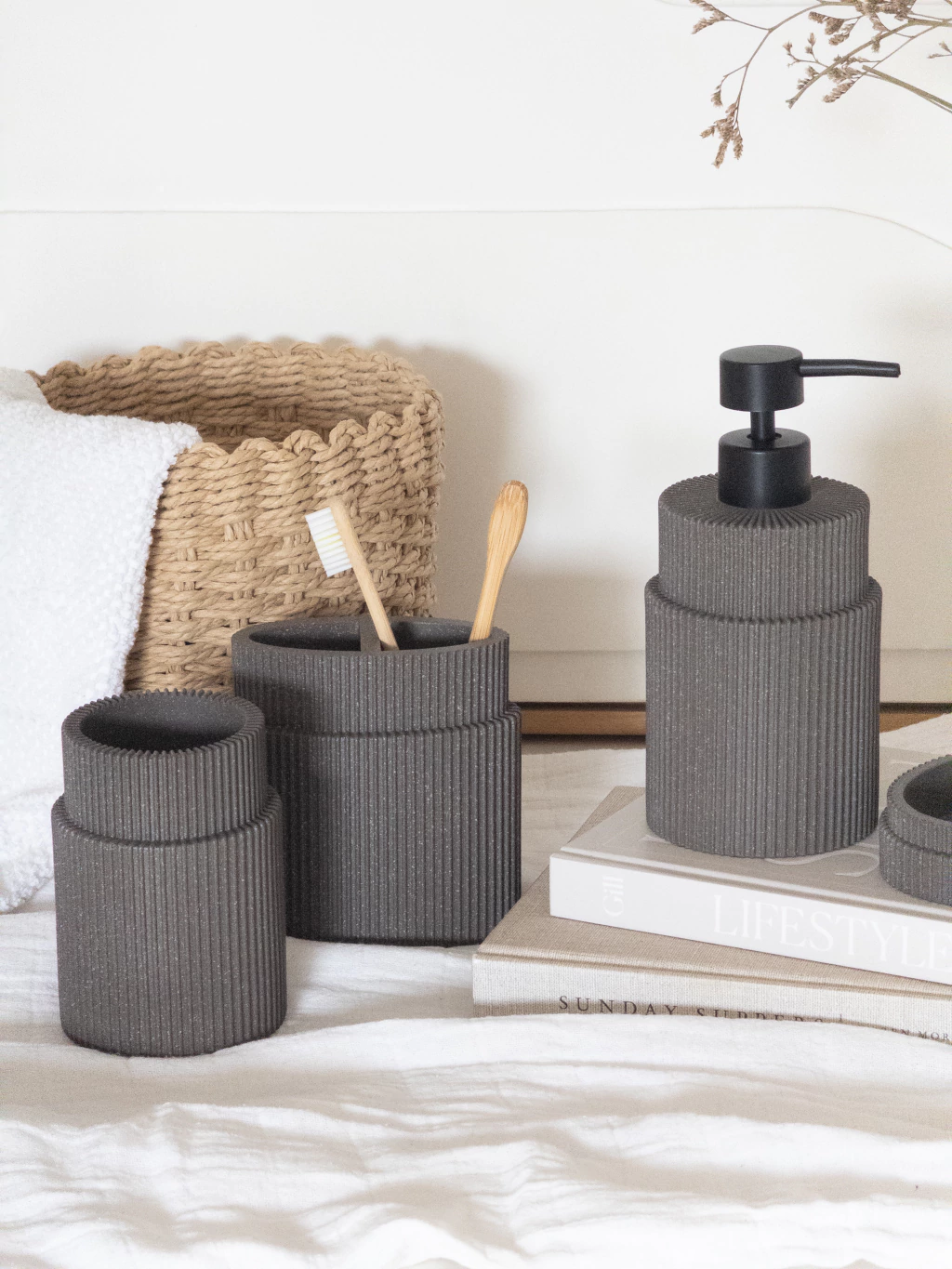 Incluye: dispenser, jabonera, vaso y porta cepillos.