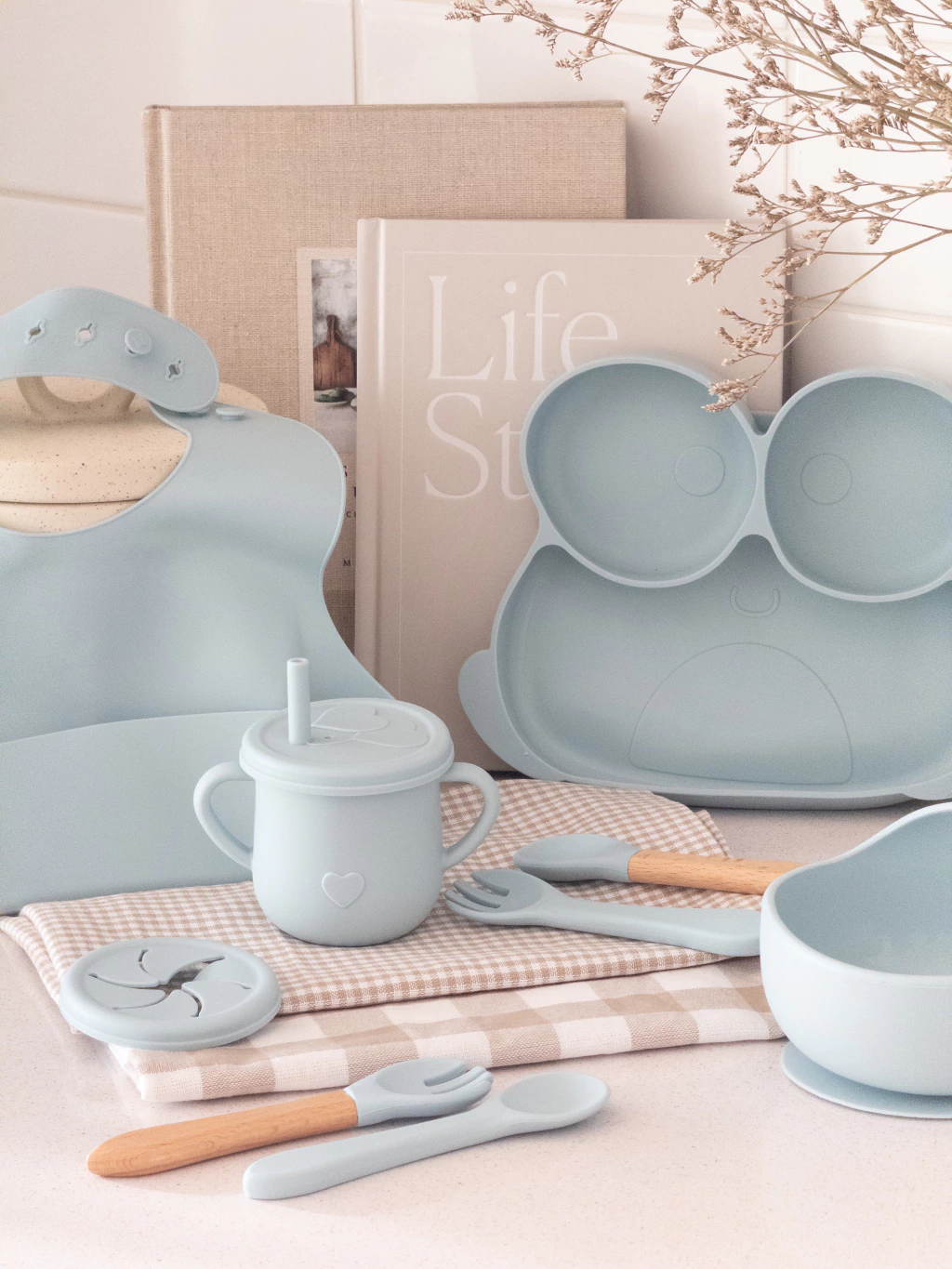 Set infantil de 8 piezas, de silicona forma Ranita color celeste. Este set incluye una cucharita de silicona, un tenedor de silicona, una cuchara de silicona combinada con bambú, un tenedor de silicona combinado con bambú, un bowl de silicona, un plato en forma de rana con 3 divisiones y un babero antiderrame de silicona.