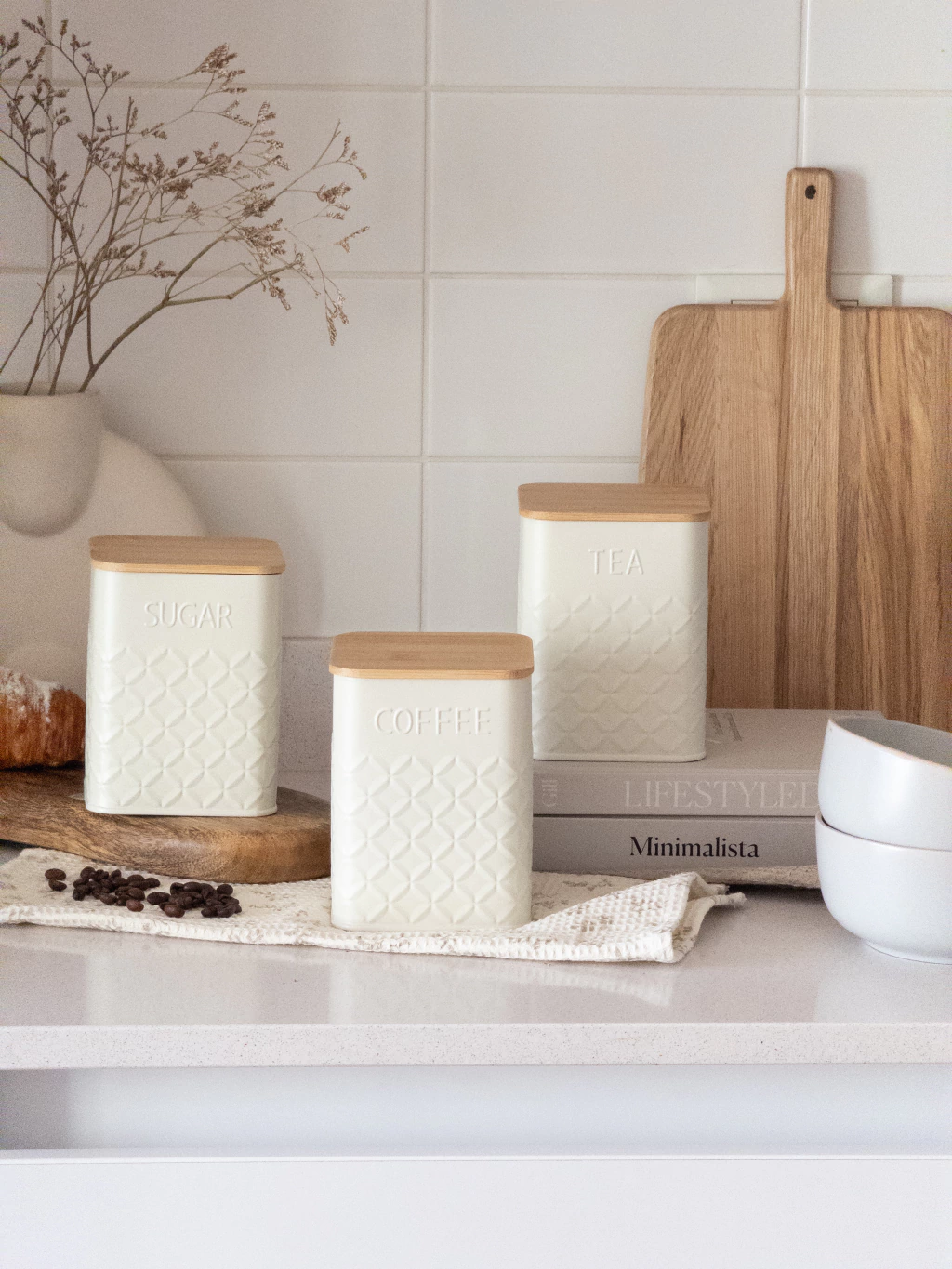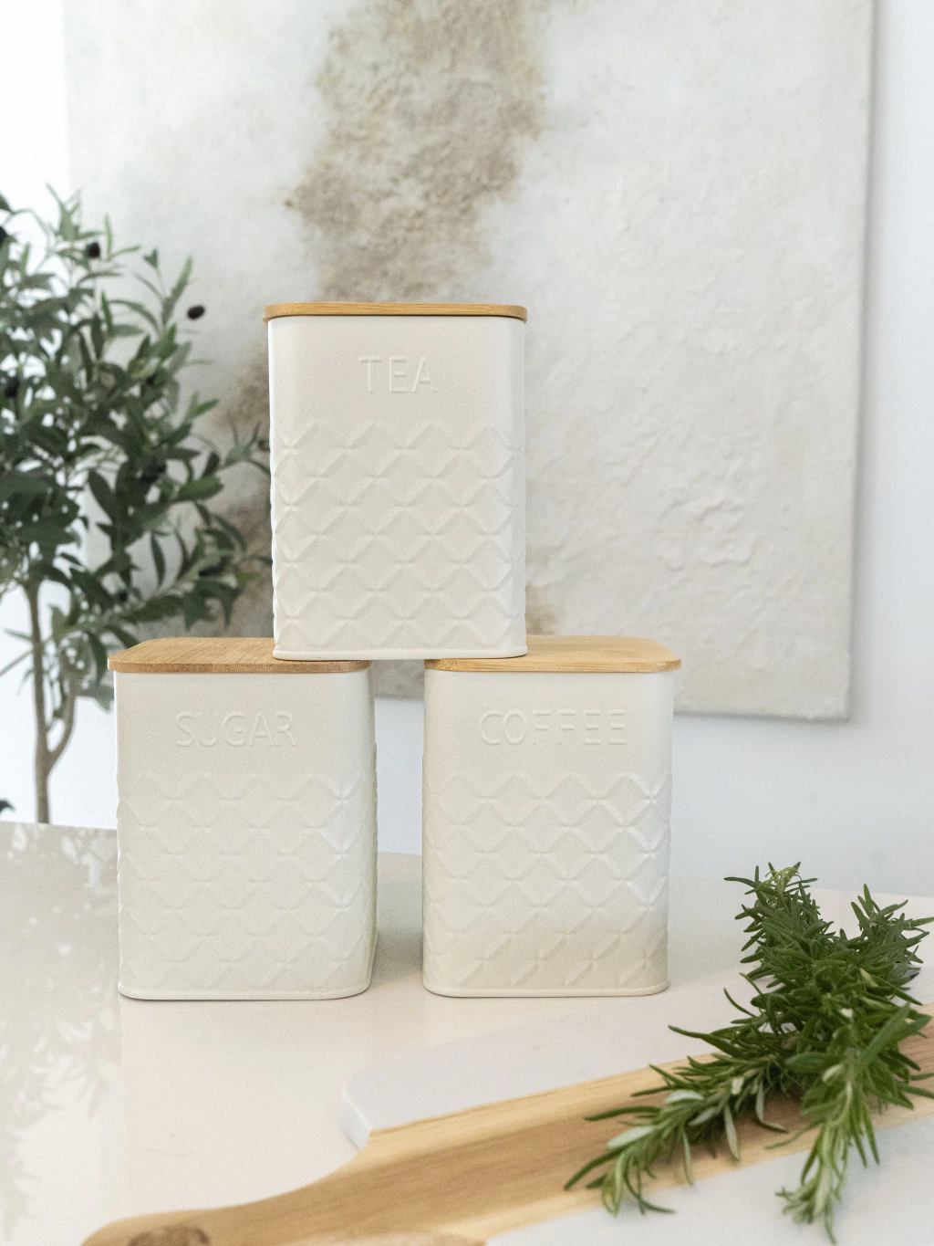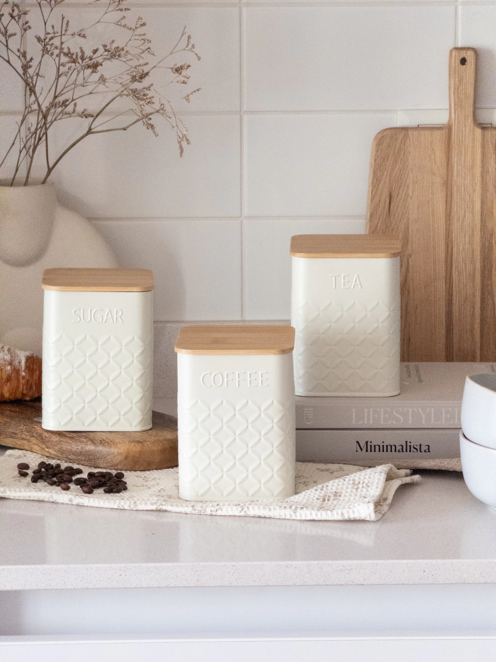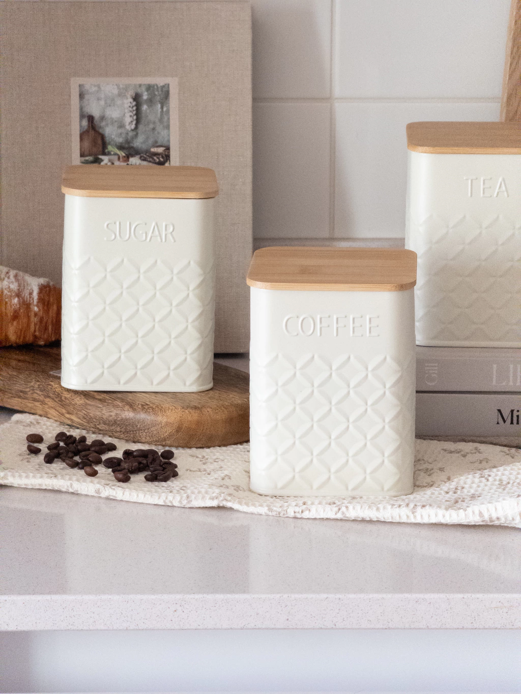 Set de contenedores con tapa, fabricado en metal combinados con tapa de bambú y rotulados en inglés para azúcar, té y café. Ideales para mantener tus ingredientes secos, ordenados y protegidos.