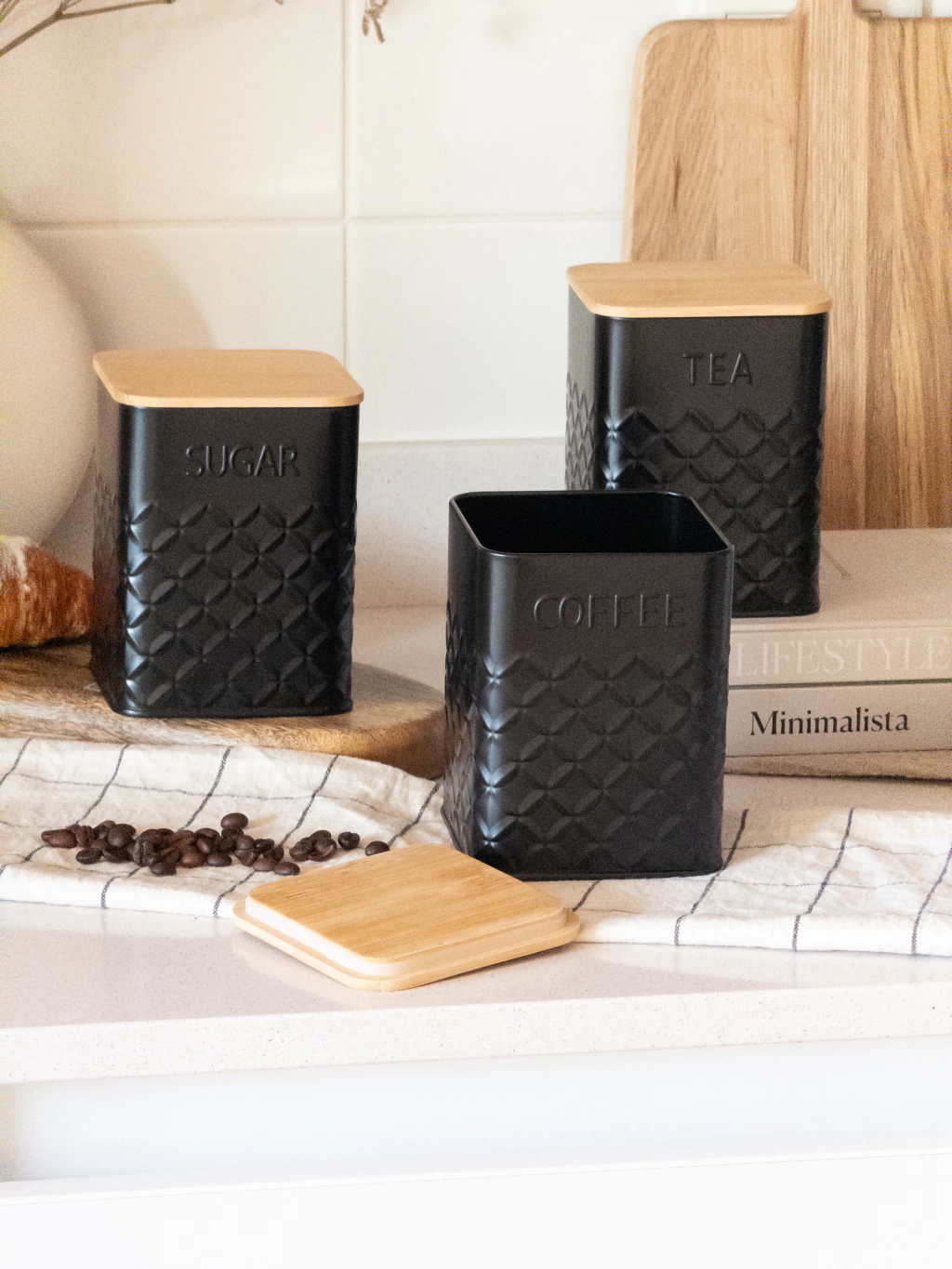 Set de contenedores con tapa, fabricado en metal combinados con tapa de bambú y rotulados en inglés para azúcar, té y café. Ideales para mantener tus ingredientes secos, ordenados y protegidos.