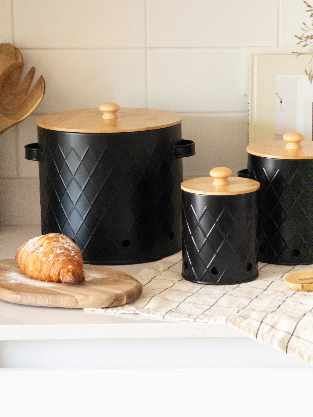 Set de contenedores XL fabricado en metal con tapa de bambú u manija lateral metálica. Diseño de rombos con relieve al tacto, esta compuesto por un contenedor grande, mediano y chico. Ideales para mantener tus ingredientes secos, ordenados y protegidos.