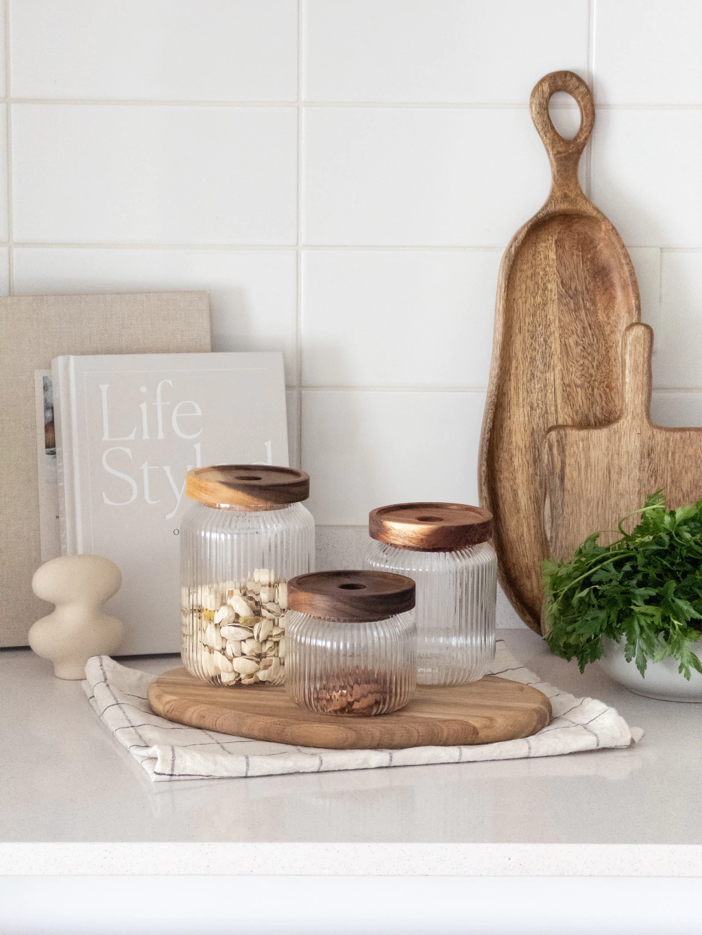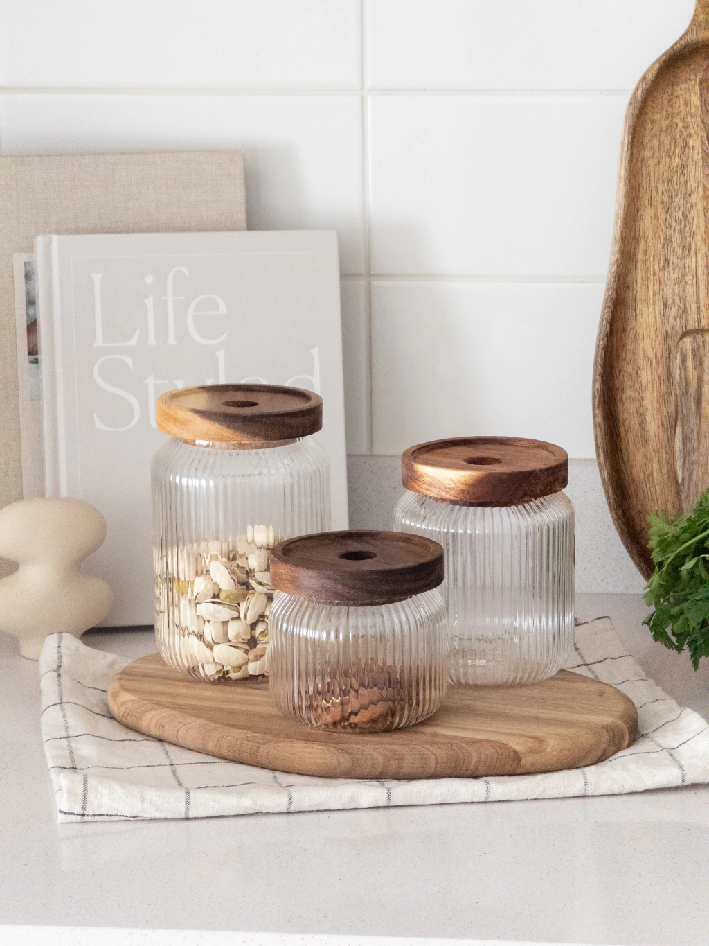 Set x3 contenedores de vidrio con relieve y tapa de madera, ideales para almacenar y mantener frescos tus alimentos.