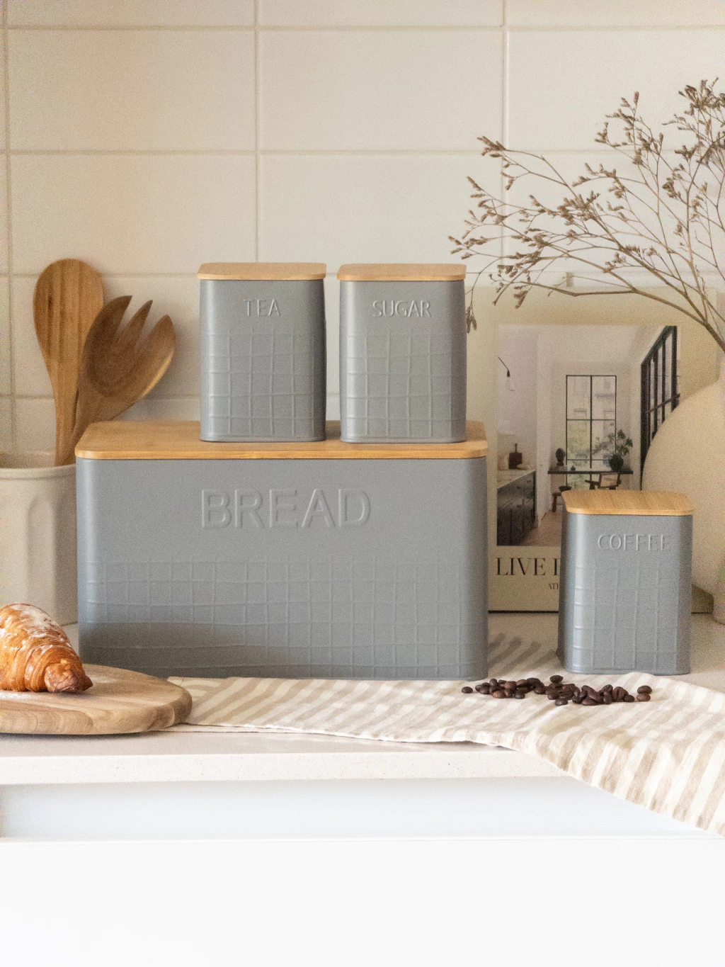 Set de contenedores fabricado en metal combinados con tapa de bambú y anillo de goma para asegurar su cierre. Ideales para mantener tus ingredientes secos, ordenados y protegidos.