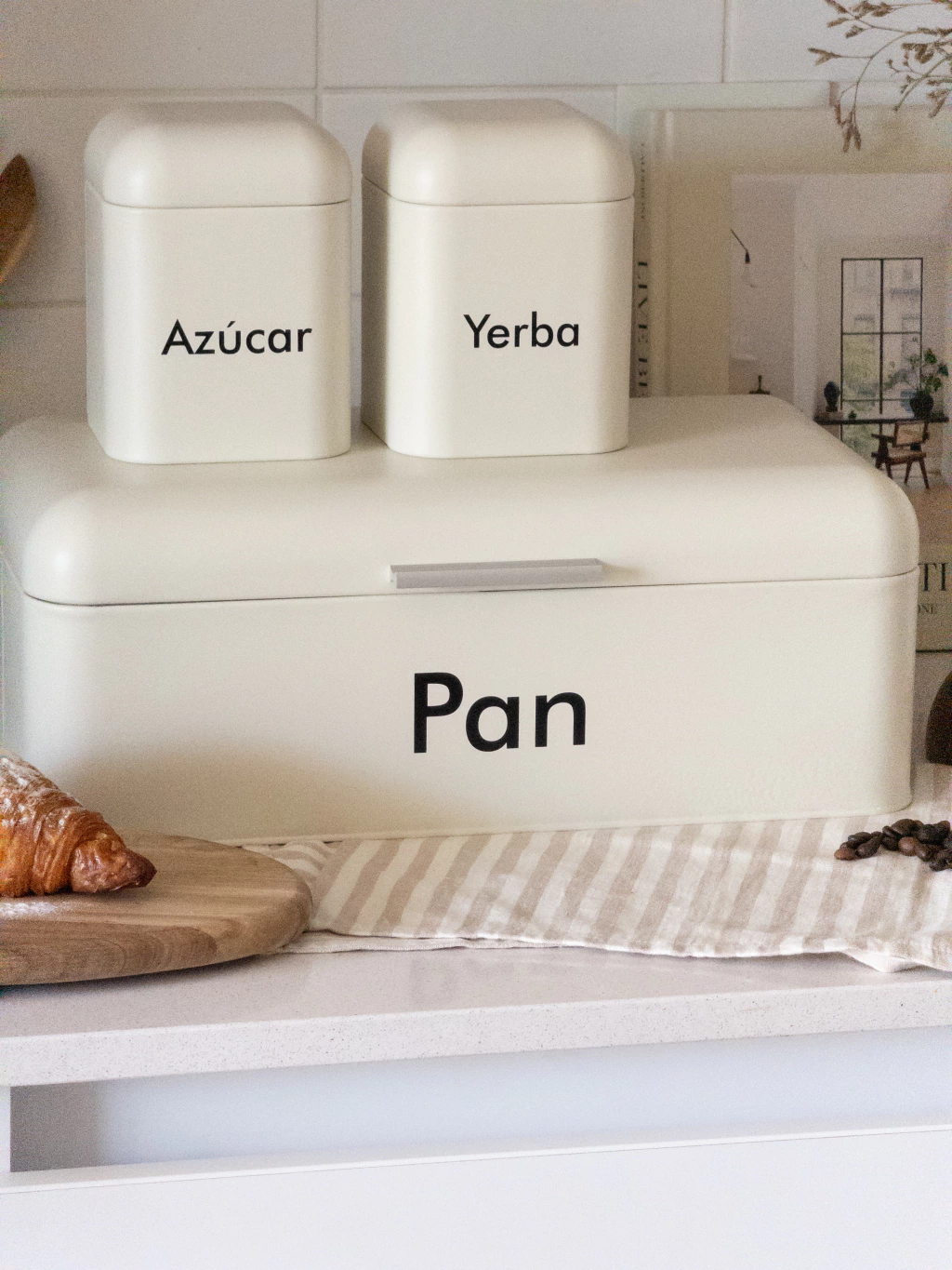 Set de contenedores fabricado en metal resistentes y duraderos. Tapa metálica con anillo de goma para asegurar su cierre. Serigrafia en la cara frontal del contenedor con los nombres de pan, café, yerba y azúcar.