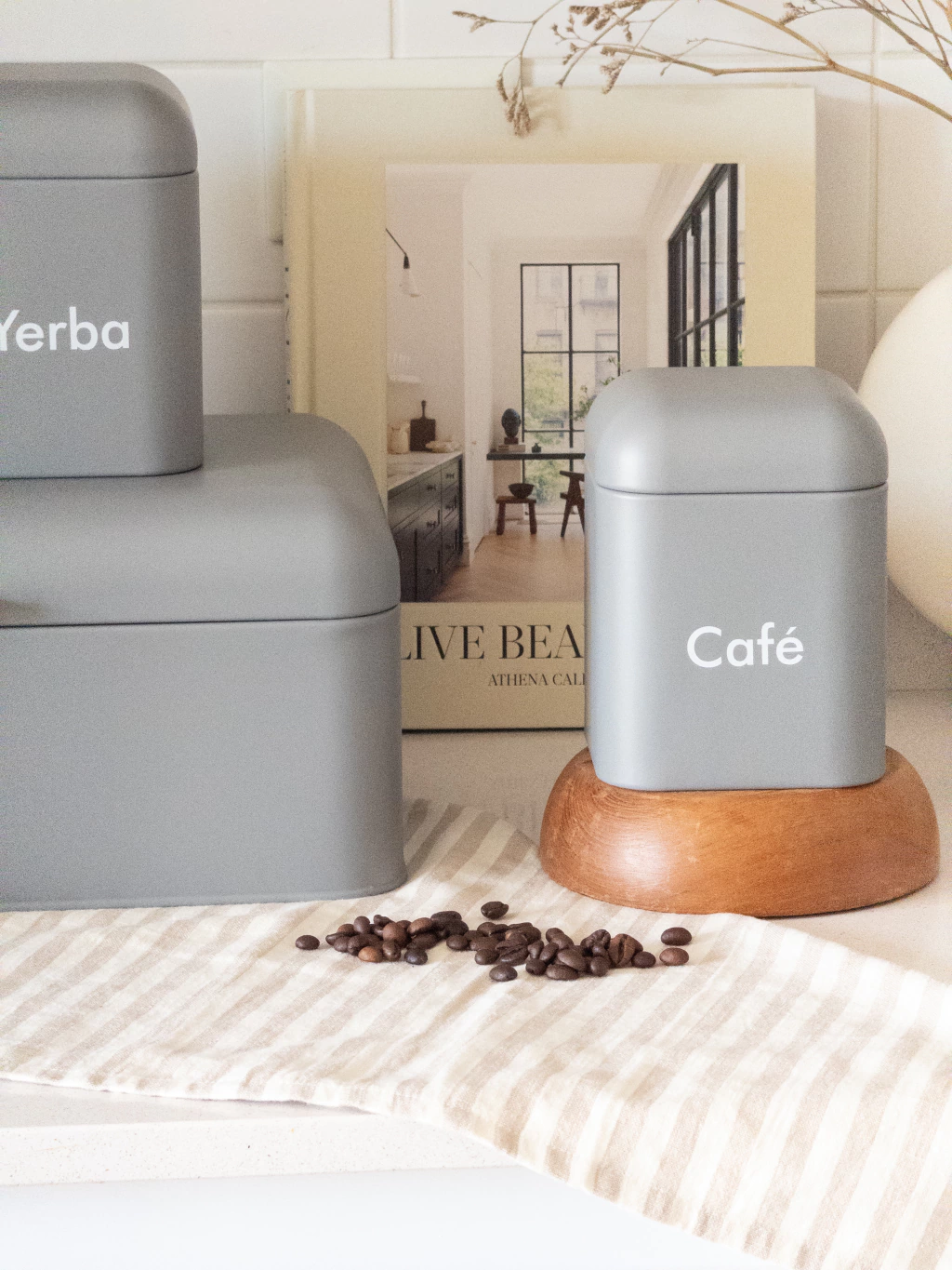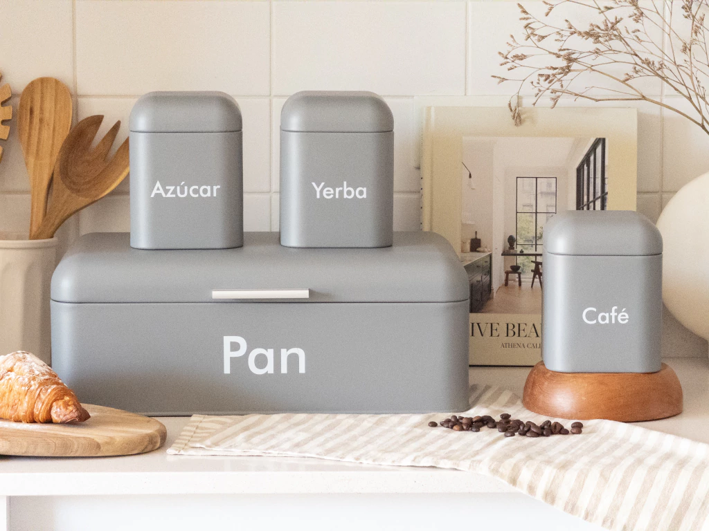 Set de contenedores fabricado en metal resistentes y duraderos. Tapa metálica con anillo de goma para asegurar su cierre. Serigrafia en la cara frontal del contenedor con los nombres de pan, café, yerba y azúcar.