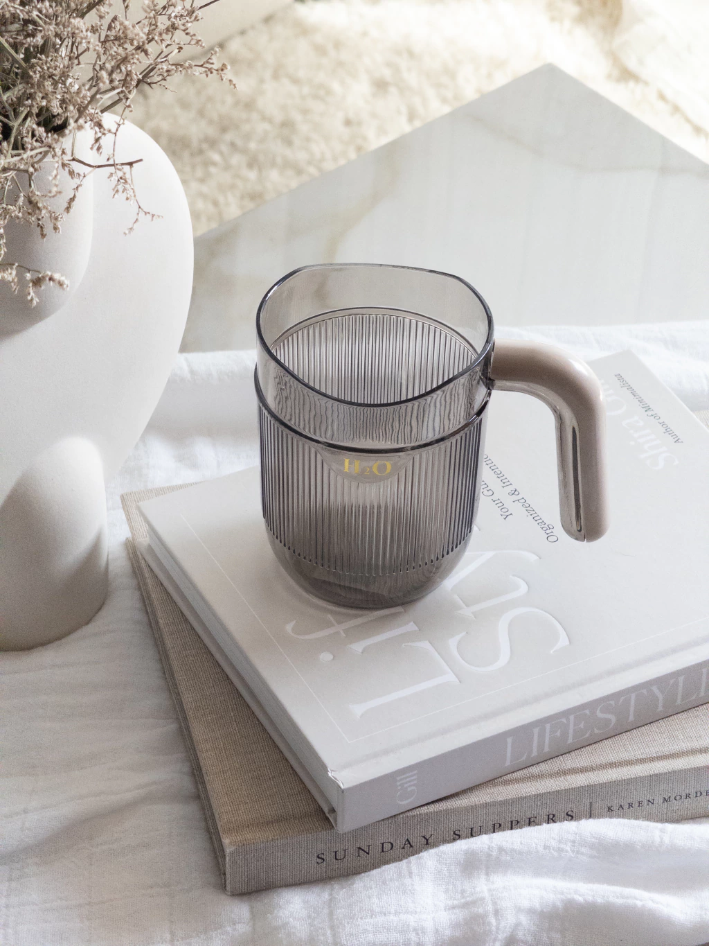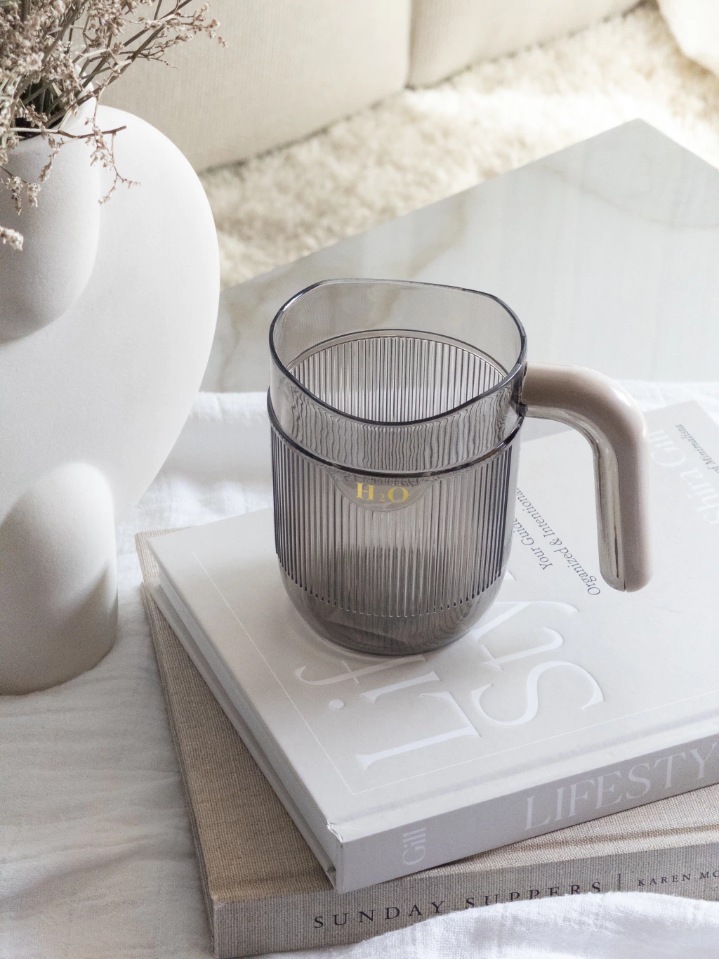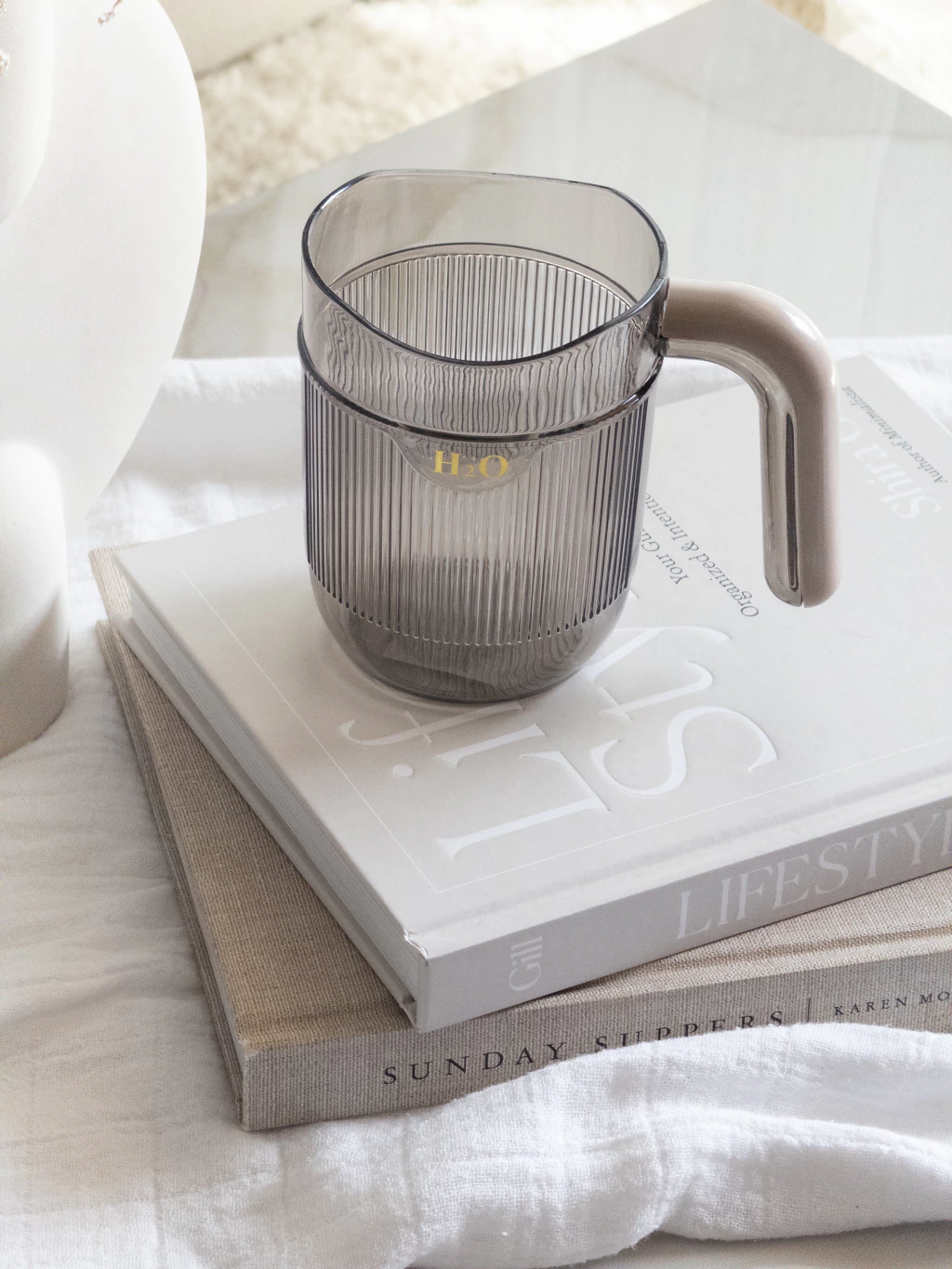 Taza con borde irregular y textura rayada en su superficie. Mango de acrílico, con cubierta en color beige. Posee el texto H2O en color dorado en el frente de la taza.