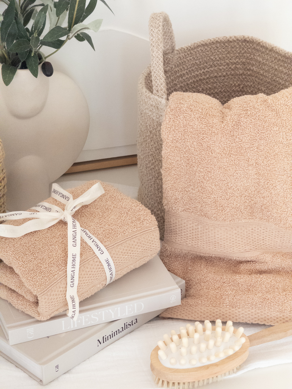 Toallón beige con excelente capacidad de absorción, perfecto para un secado rápido y eficiente después de la ducha. Fabricado con 75% algodón, 25% poliéster.
